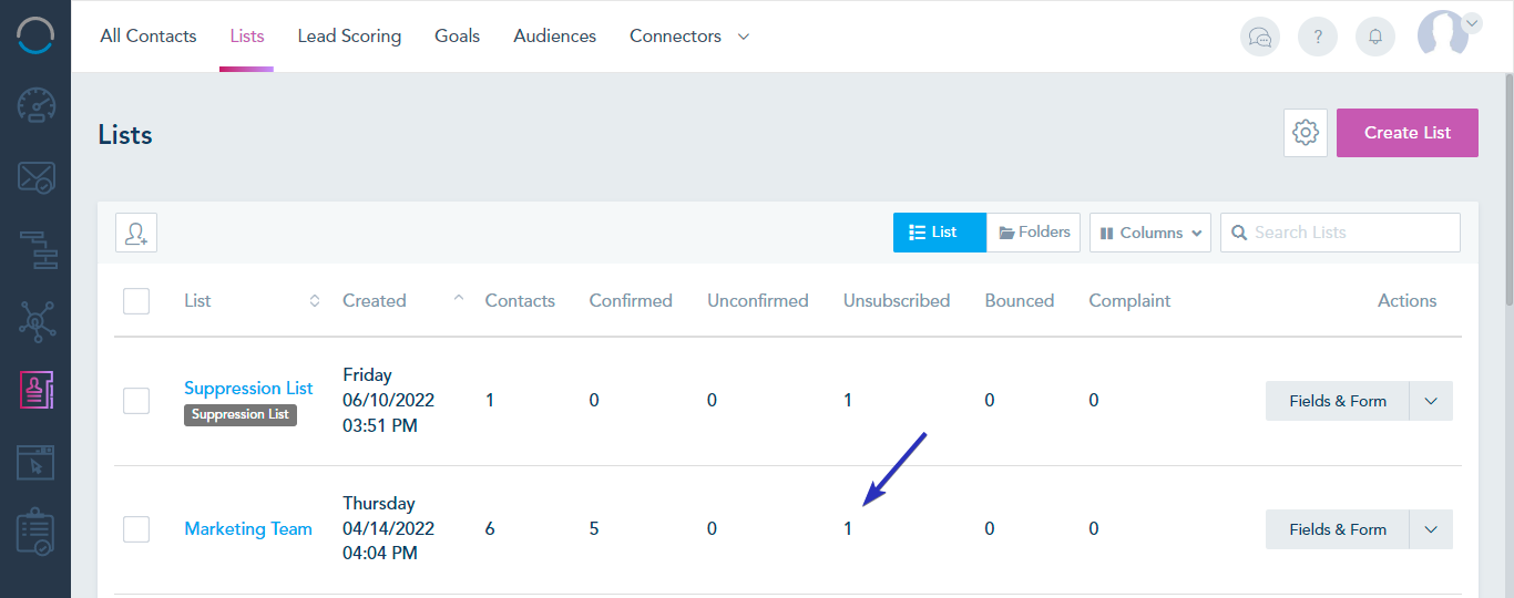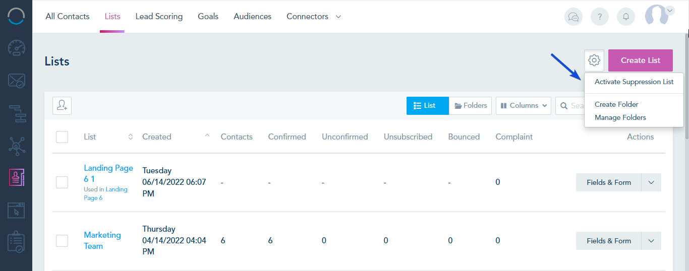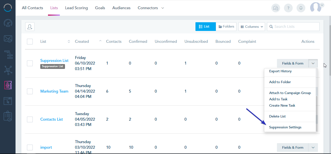 To do that, first, go to the Lists tab and click on the drop-down next to "Fields & Form". Next select Suppression settings as shown in the picture below.