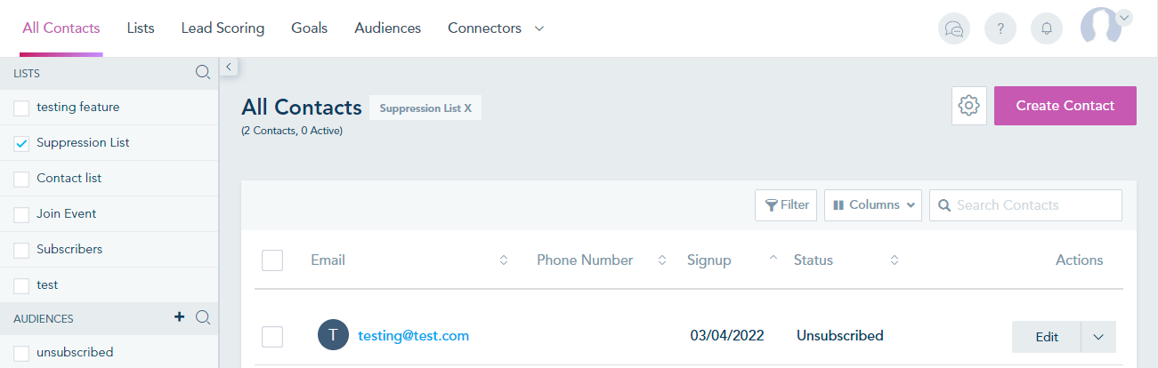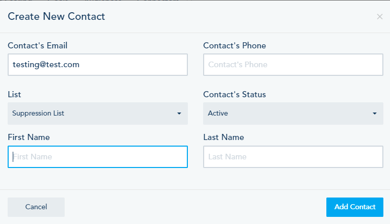 In some cases, you might see the Contact's status as Active when creating a contact in Suppression List. However, once you click Add Contact or you import contacts, they will automatically as Unsubscribed (see pictures below).