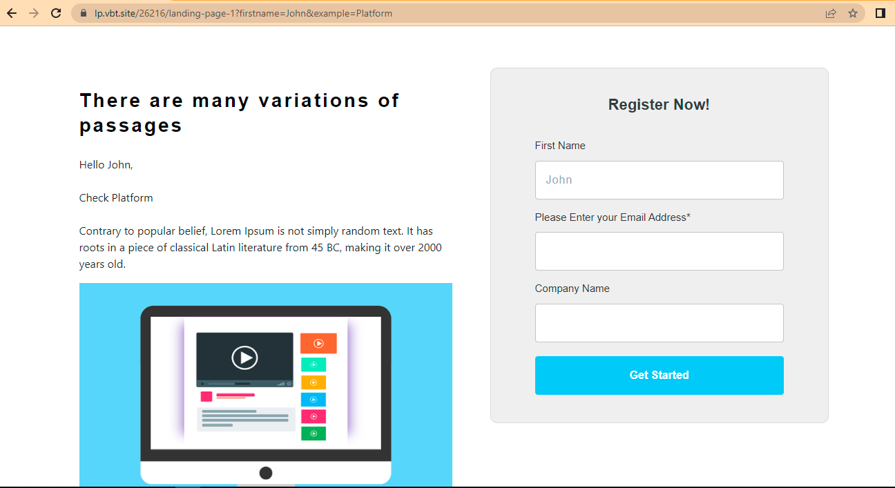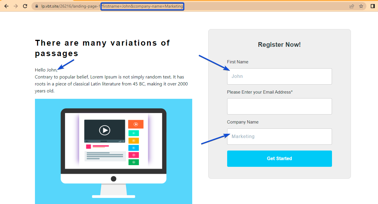 Add the parameters to the landing page link, for example: https://lp.vbt.site/26216/landing-page-1?firstname=John&company-name=Marketing