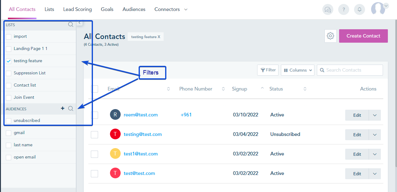 You can manage all your Contacts, Lists and Audiences from one page by going to Contacts --> All Contacts. On this screen you can view and search all your contacts and filter them by List or Audience name from the left panel.