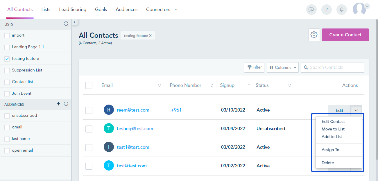 Each contact can be edited, moved to another list, added to another list (copy), assigned to Group or User, or deleted from your account. You can also add a new record by clicking on Create Contact.