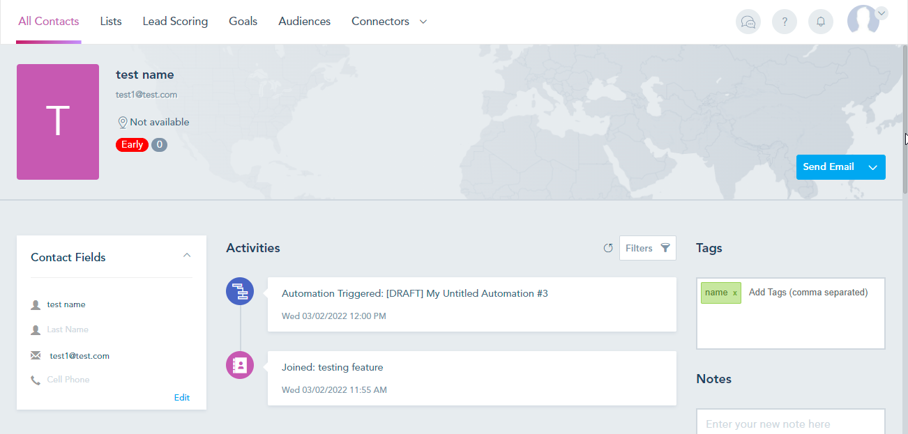 To preview the timeline of a contact, click on their email address. You will be able to view the Contact history of engagement and additional contact details such as Lead Scoring, Geo-location, Referral Source, Subsequent Referral source for each engagement and much more.