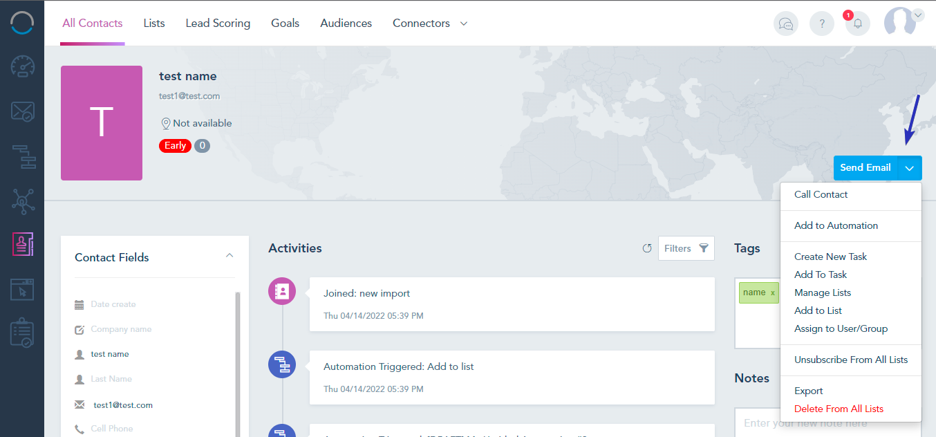To manage the lists for this contact, send a message, Call or Unsubscribe from Lists, click the options on the top right panel for this contact: