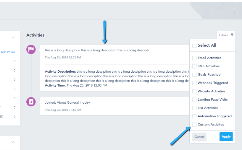 Note that you can use the activity filter to preview the custom events within the contact's timeline.