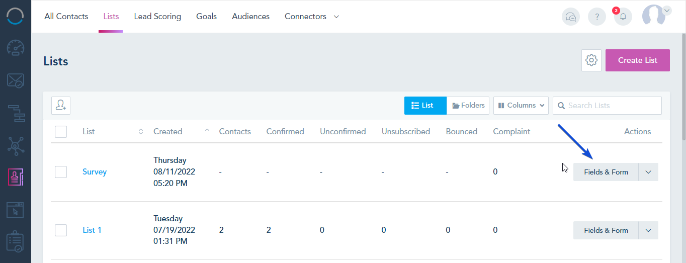 - Locate the list you want to configure and click on "Fields & Form" for that list.