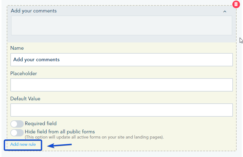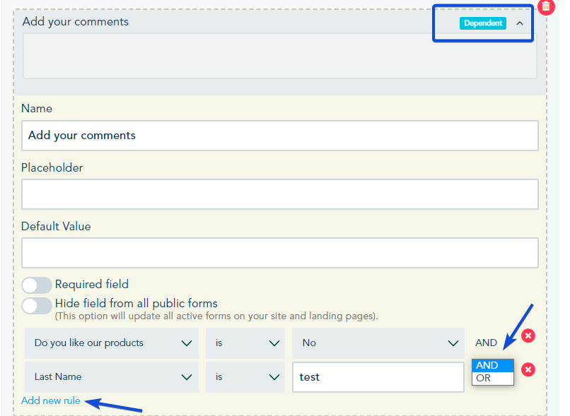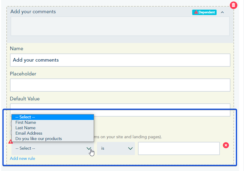 - Click on the field, and then click on "Add new rule" to define the condition for its visibility.