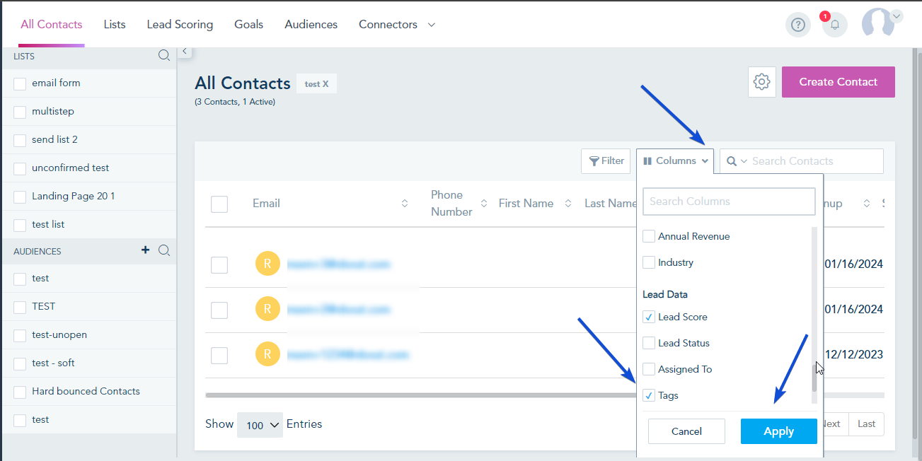 To export contacts with their tags within a list, choose the list from the left filter column, click the Columns option and select the "Tags" option: