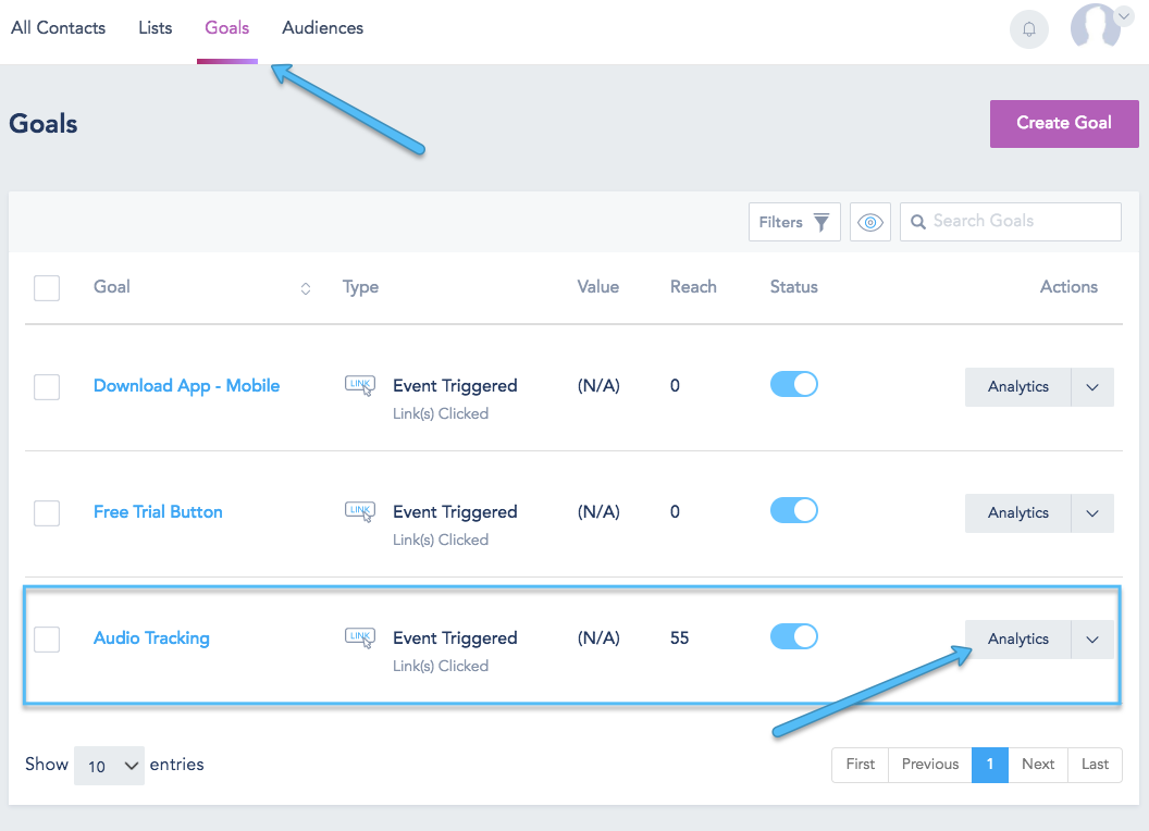The page will display a table summary of your goals type and performance summary. Find your desired goal and click on the Analytics option next to that goals.