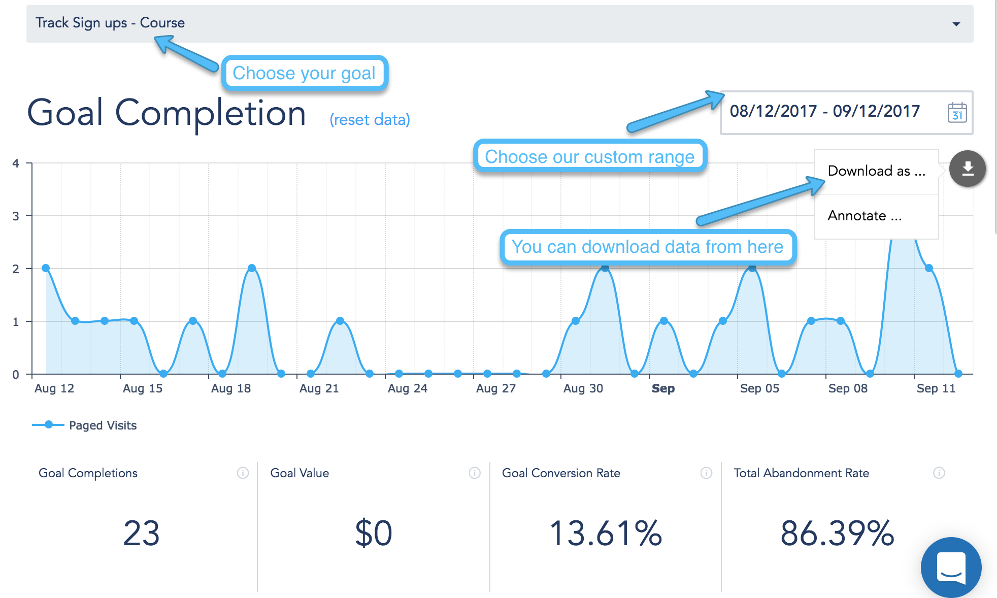 The top preview of the report include a drop down to easily switch between goals and a line-chart of the daily conversion of that goal. You can change the default time period of that report by clicking on the date-picker.