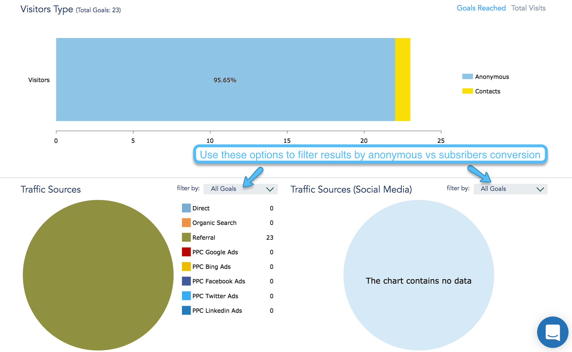 - The bar chart displays the percentages for the types of users who reached that goal. It is broken down by Anonymous (random visitors without contact information) and Contacts (Active contacts that are cookied and can be found under your Contacts lists).