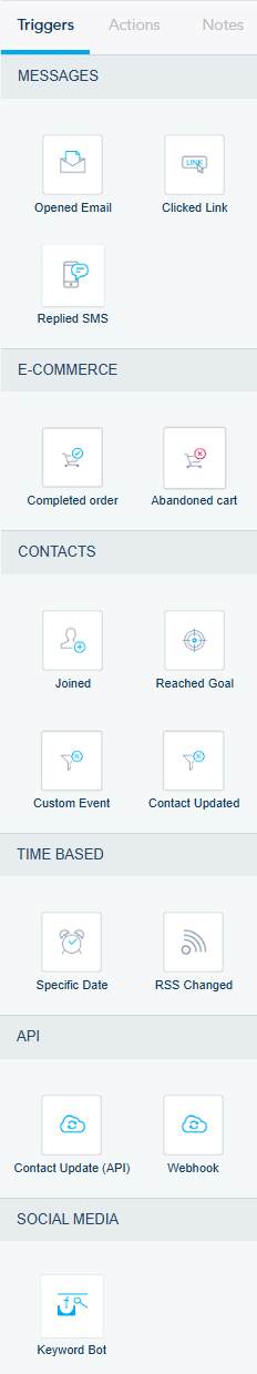 We have a list of Triggers divided into Messages, E-commerce, Contacts, Time Based, and API.