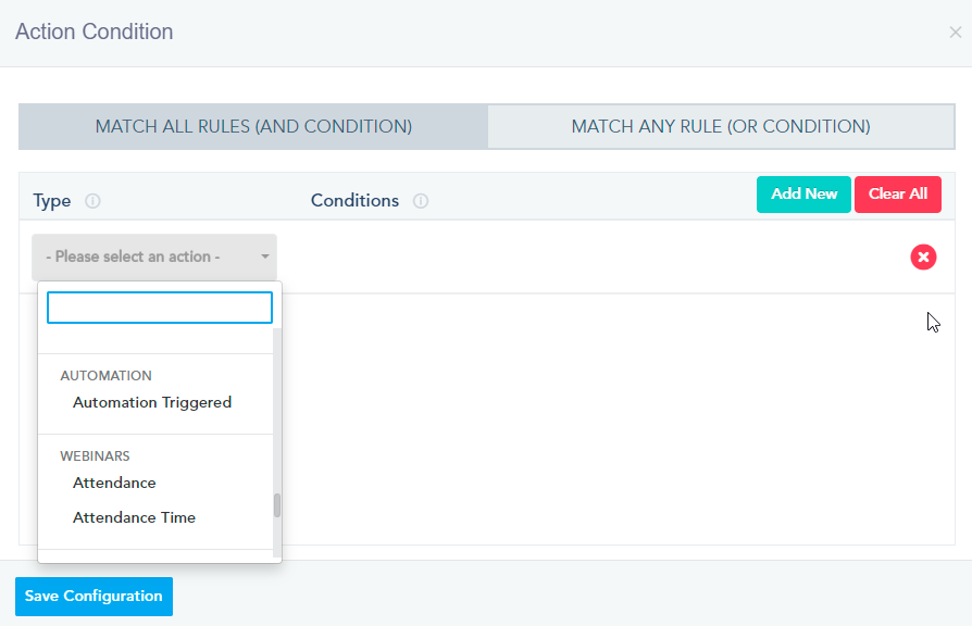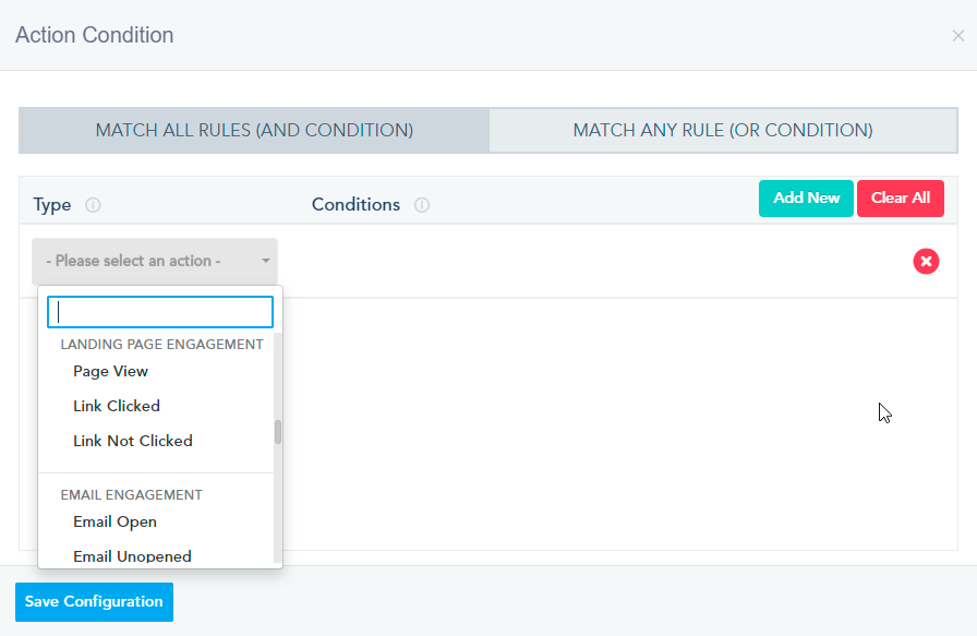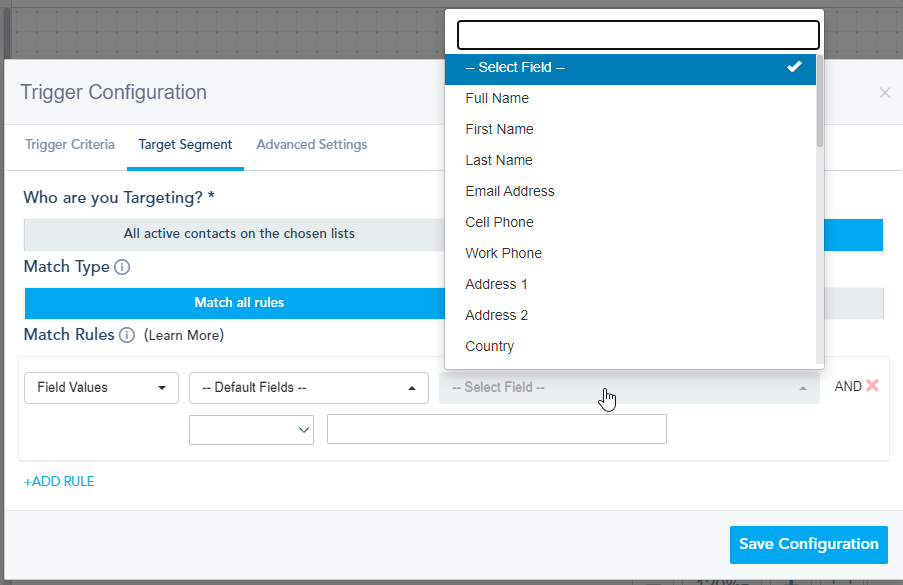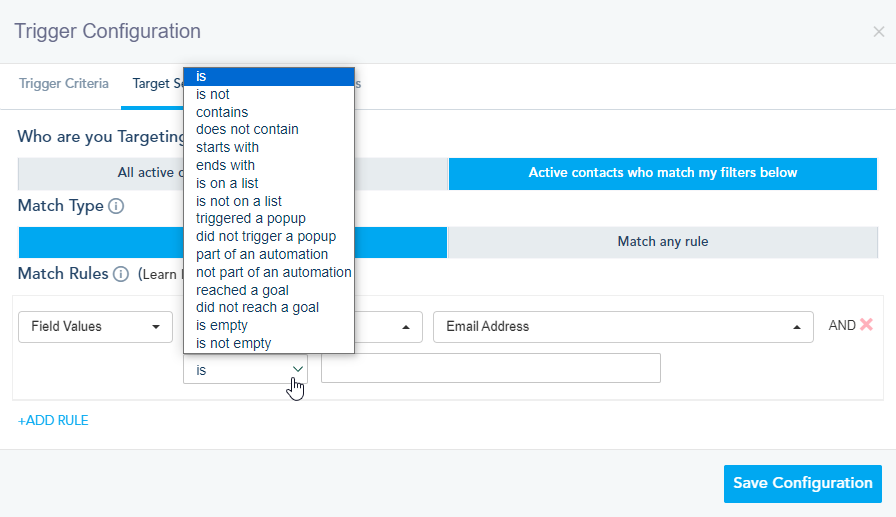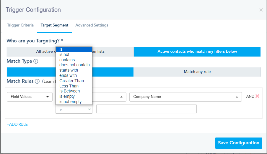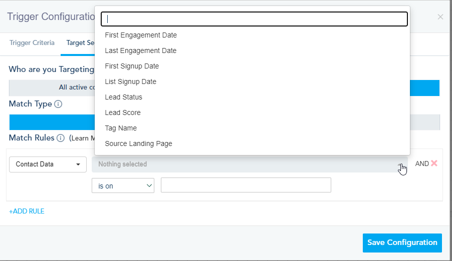 Lead Status: If you have lead scoring setup, you can target leads who match certain lead status you created within the system. Available options will be a drop-down of statuses that you created on the lead configuration page.