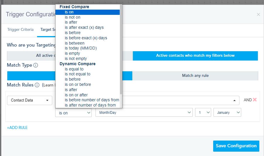 - Contact Updated: This Trigger takes action whenever a contact field in the specified list(s) is updated.