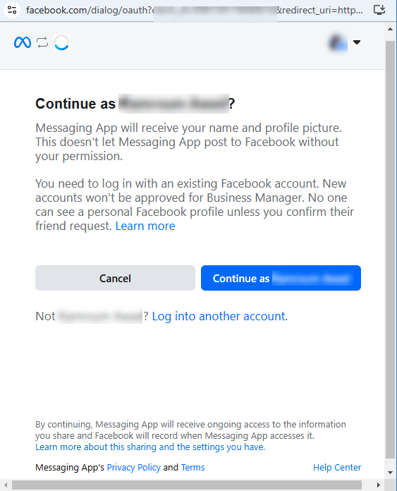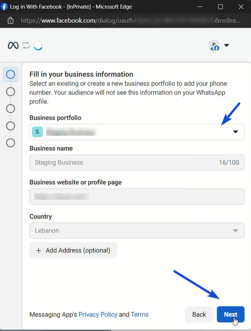If you already have a Meta Business Account, select it and proceed or create a new Meta Business Account, by entering your business name, website, email, and country, then click on Next.