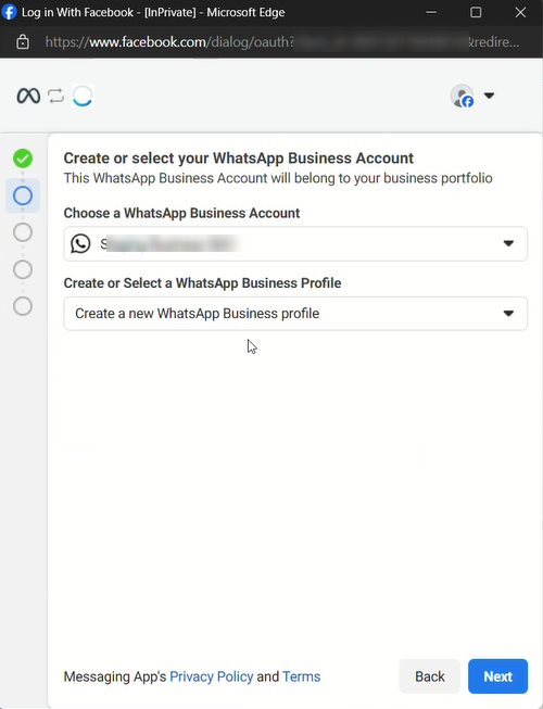 Select your existing WhatsApp Business Account. or create an account by entering an account name and business type, then click Next.