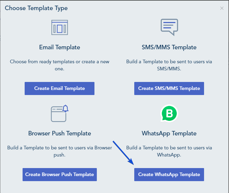 In the WhatsApp Template, you need to select a Type, a number and create your message.