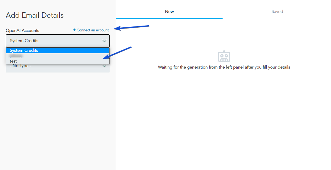 Choose whether to use the AI Content Assistant add-on credits (System Credits) or connect your own OpenAI account for content generation.