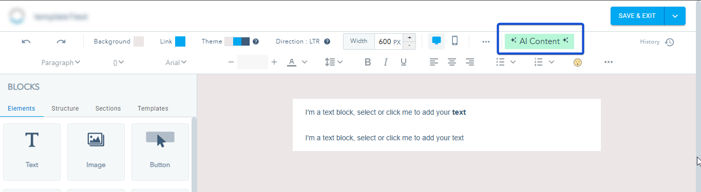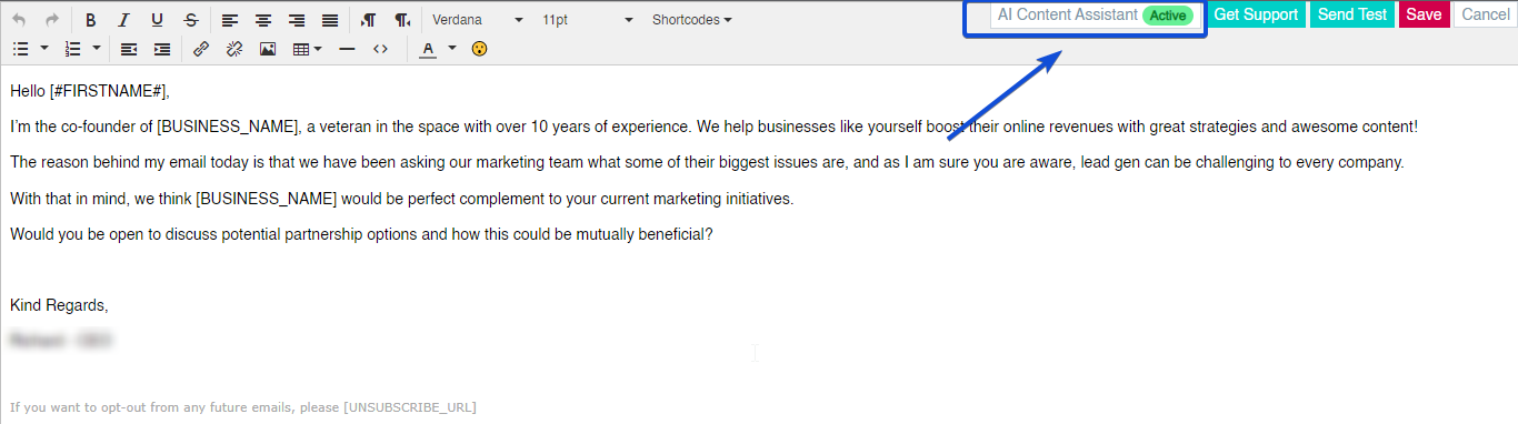 To Generate Email Content, click on AI Content Assistant in the top toolbar.