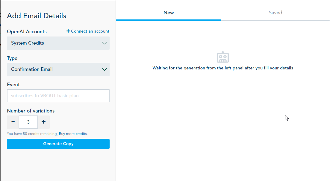 - Select the appropriate email type and fill in the relevant settings. These settings play a crucial role in influencing the content generation process. Additionally, indicate the number of email variations you wish to generate. Once you've provided all the necessary information, click on "Generate Copy."