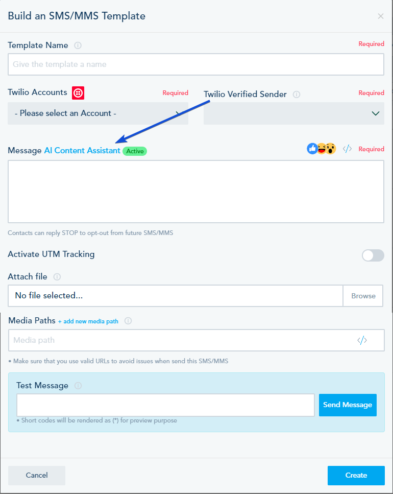 - You can find the AI Content Assistant while creating your SMS/MMS template.