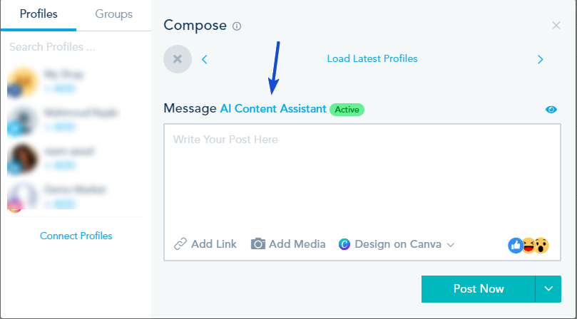 - When composing a new social media post, you can find the AI Content Assistant in the Compose post window.