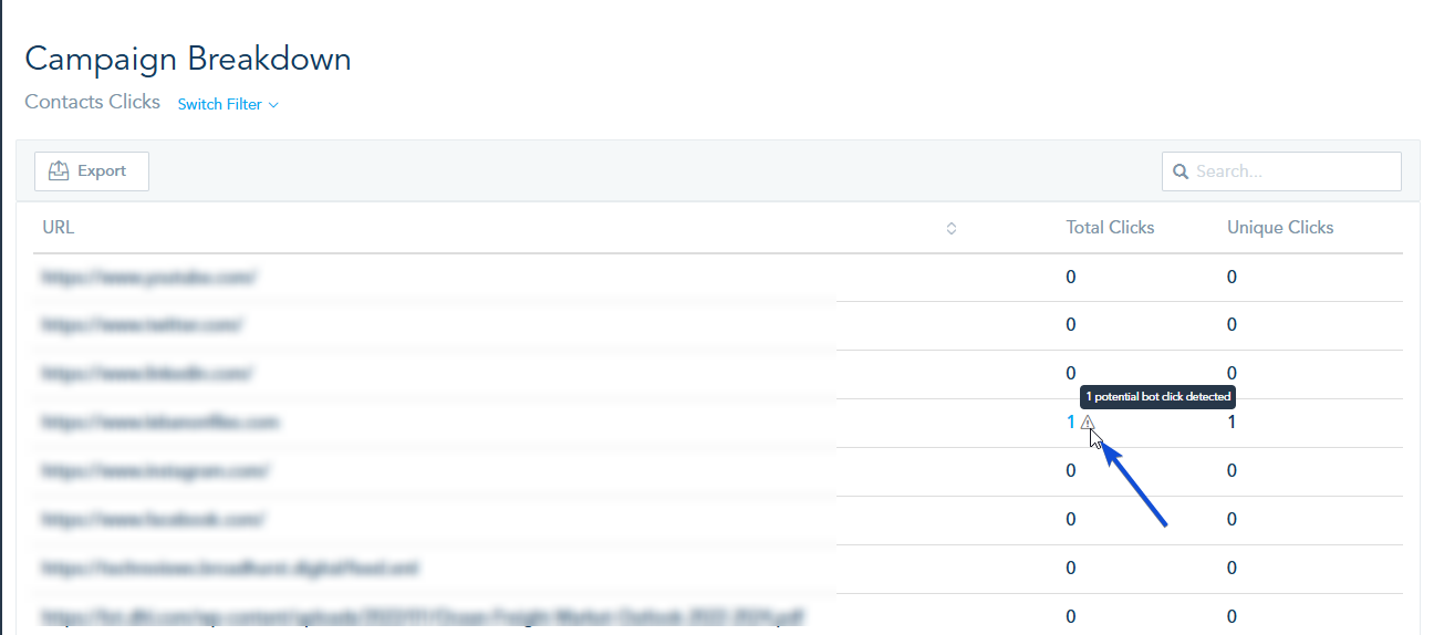 In Campaign Breakdown, go to Contact Clicks to identify the specific links where bot clicks were detected.