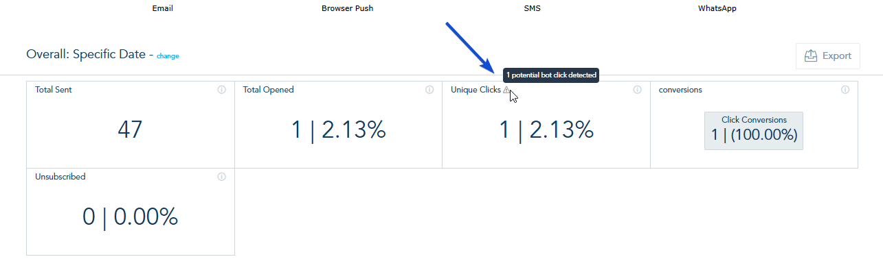 You can identify the bot clicks detected in your email sent (campaign/ automated message). This will help you better understand and manage suspicious click activity, ensuring more accurate email performance tracking.