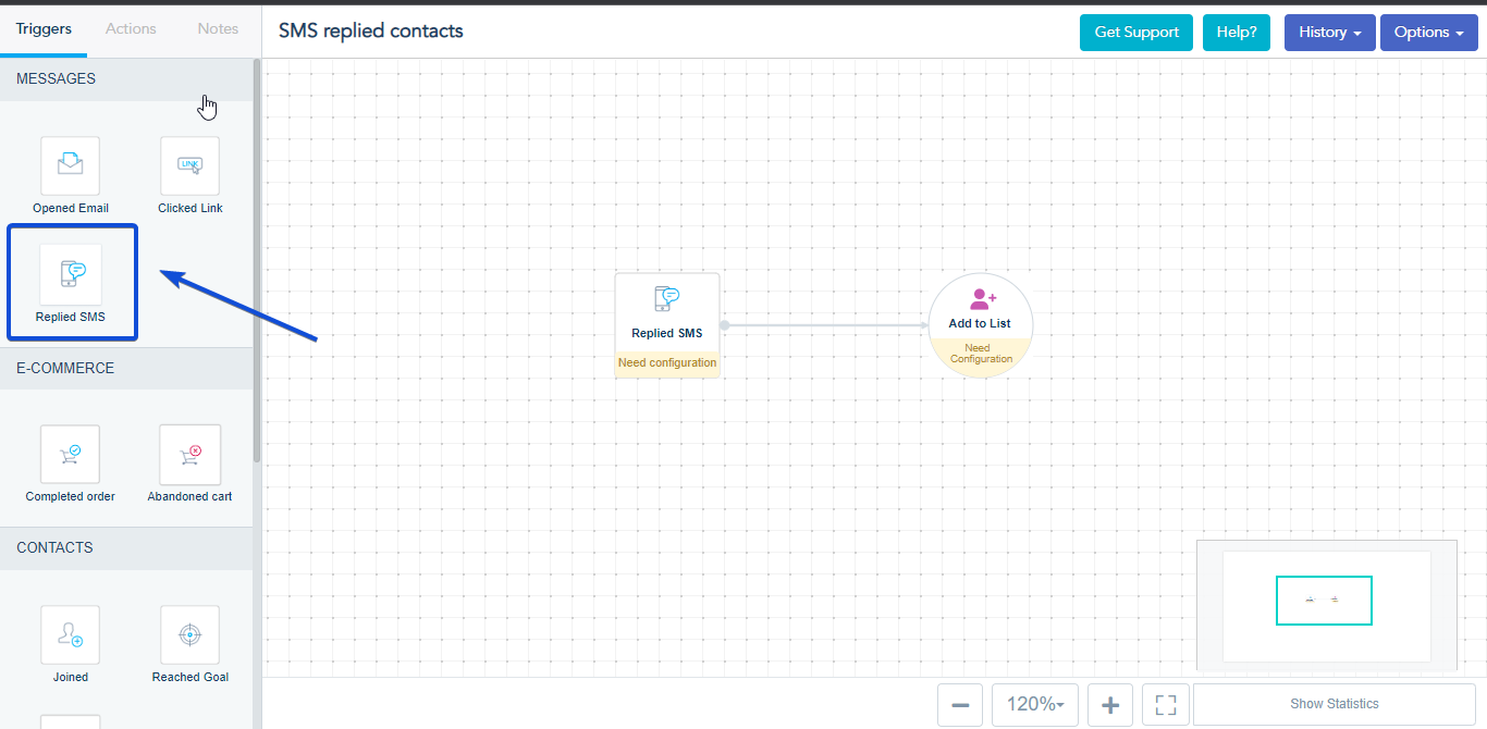 Please note that the automated SMS template attached to the “SMS Replied” trigger must be the last SMS sent and delivered to the contact.