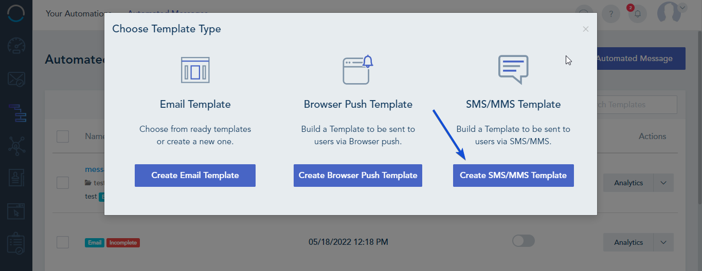 Go to Automation -> Automated Messages -> Create Automated Message, choose to Create SMS/MMS Template.