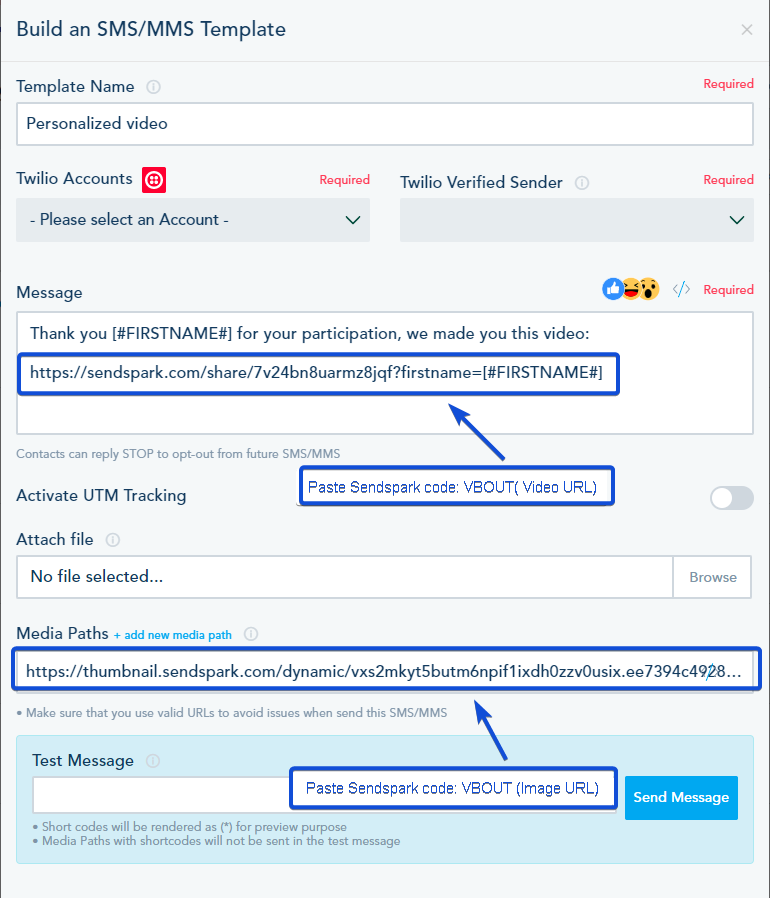 In the Message Area, paste the code you have copied from Sendspark "VBOUT (Video URL)" button.