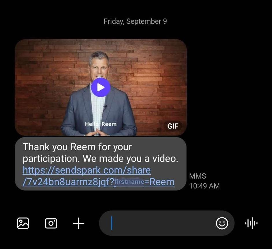 Sending dynamic videos lets you personalize videos at scale. You can embed videos in your SMS using merge tags. These merge tags let you automatically change content for each of your recipients — so you can personalize videos with the first name, company name, or job title of each person.