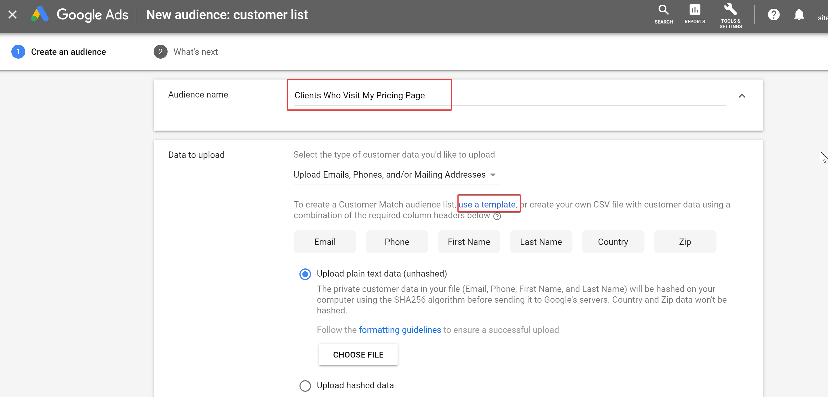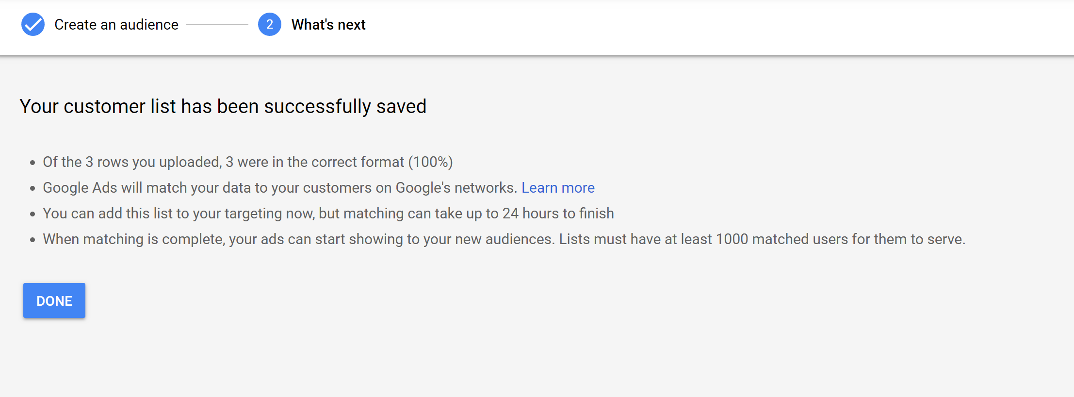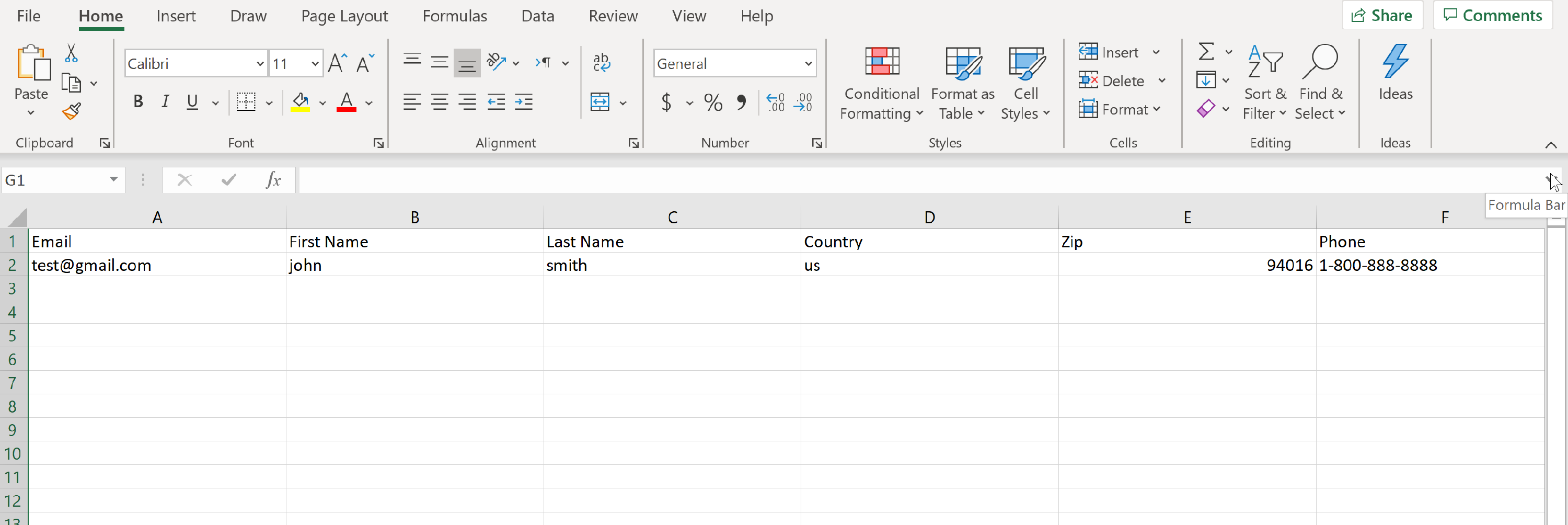 Download the sample CSV provided by Google Adwords and format it with one sample contact such as your own email: