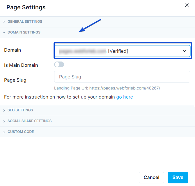 7- In the Domain Settings section, choose your domain from the drop-down in Domain and Save.