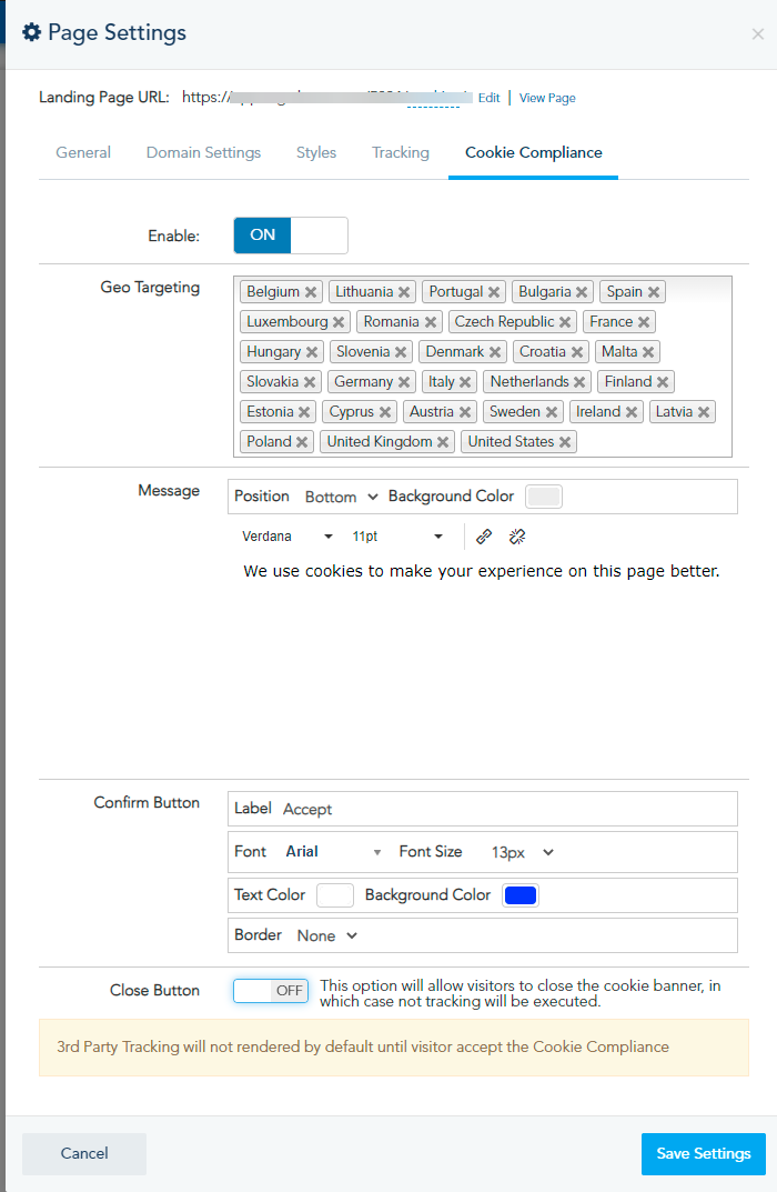 From the landing page builder, go to Tools -> Settings -> Cookie Compliance tab.