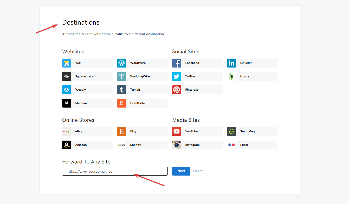 2- In Destinations, type in your site for example www.domain.com in the Forward to Any Site section, and click Next.
