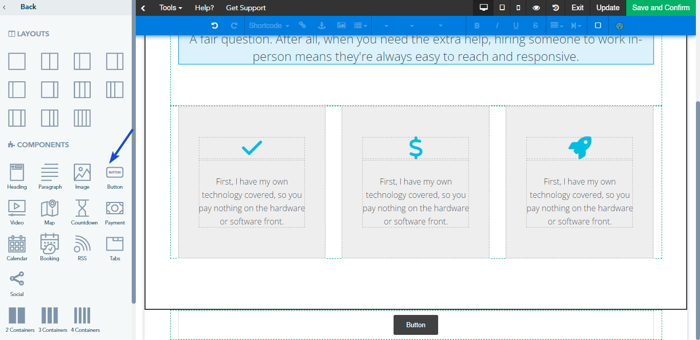 In Email or landing page builder, add a Button element from Design Element section or choose a block with a button from the Predesigned blocks.