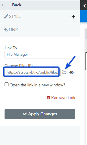 Click on the button, in the setting menu on the left choose Link -> Link to, and select File Manager.