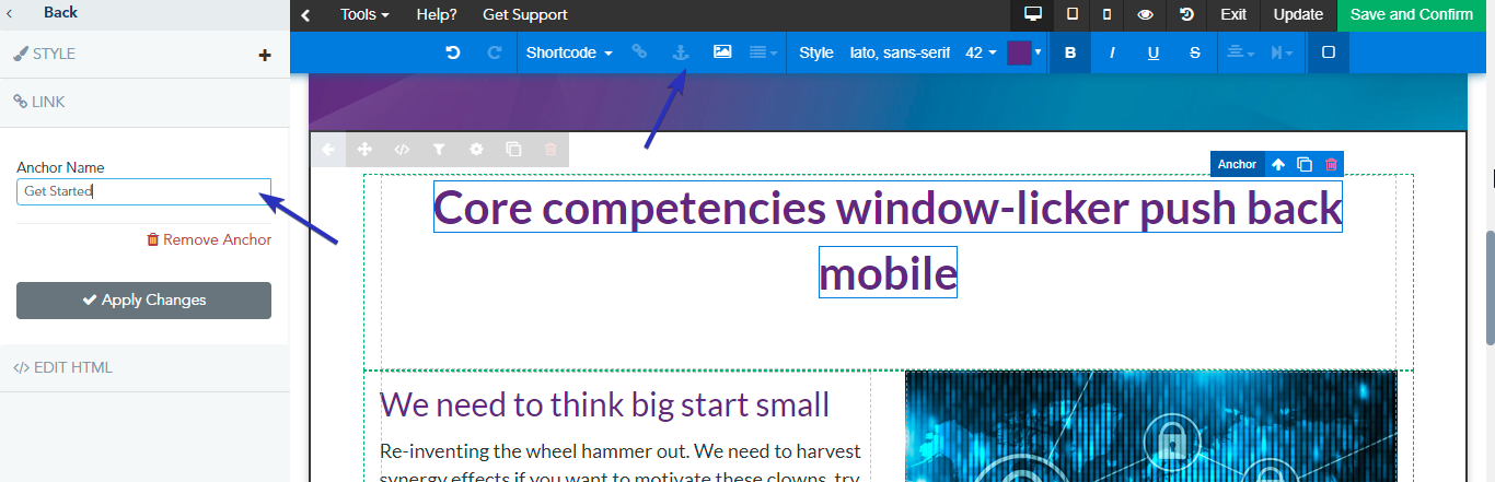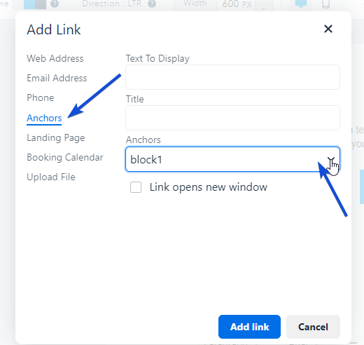 To add an Anchor Link, highlight the beginning word or icon of the section you wish to 'jump to', then click the Anchor icon on the top editor. From the left panel, give it an Anchor Name: