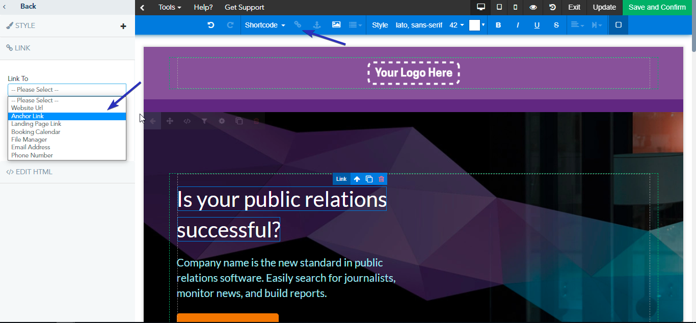 Aside from Anchor Links, you have the ability to add different types of links: