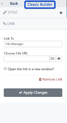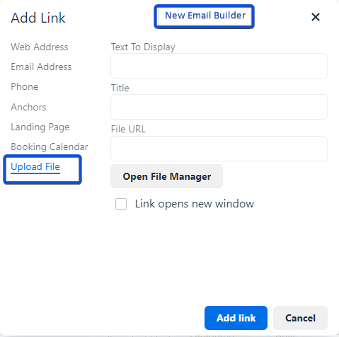 When you choose File Manager, it automatically opens all your uploaded media and files on your account. You can choose to link to a downloadable PDF, an image, video or even create a graphic on Canva.