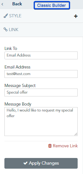 The click-to-email hyperlink lets you pre-populate, in the recipient's default email application, a predefined email, subject line, and message body. When a contact clicks on the link, their email application will open with the to Email Address, Message Subject, and Message Body already filled for convenience: