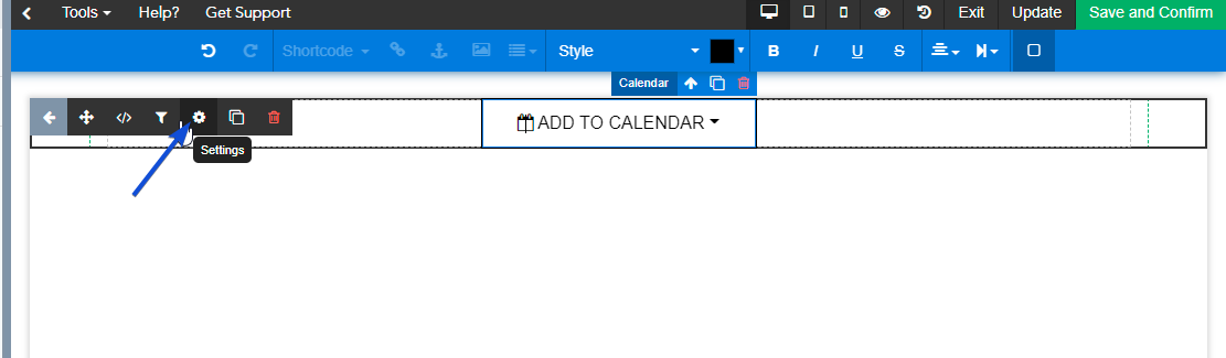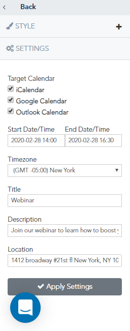 This will allow you to edit the settings for this specific block, so for example if it’s a calendar block, you will be able to select the calendar type (iCalendar, Google Calendar or Outlook Online), input the start and end dates, title, description, location and time zone for the event. This way once you publish your landing page, if someone clicks on the Add to Calendar button, they will automatically be able to add the event to their personal calendar.