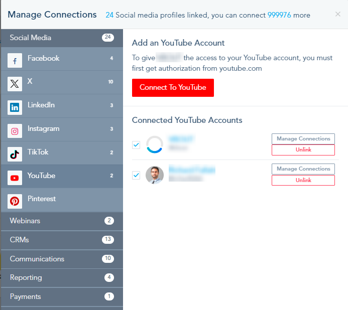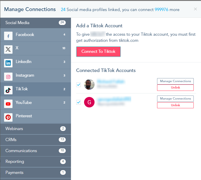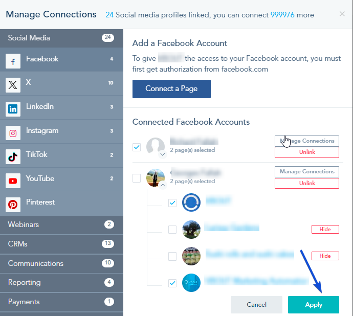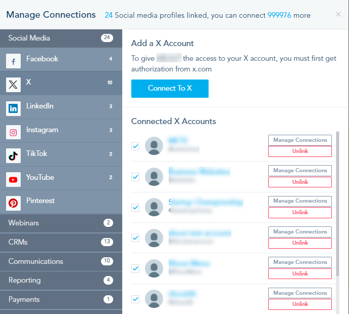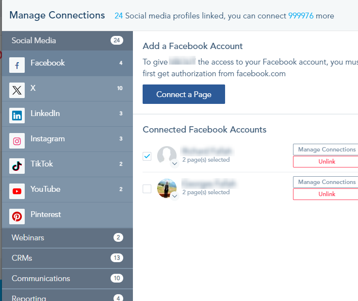 The Connection Center will open prompting you with the different profiles options to connect to the platform. From there you can preview how many profiles are connected, manage existing connections and track pages that have connection problems.