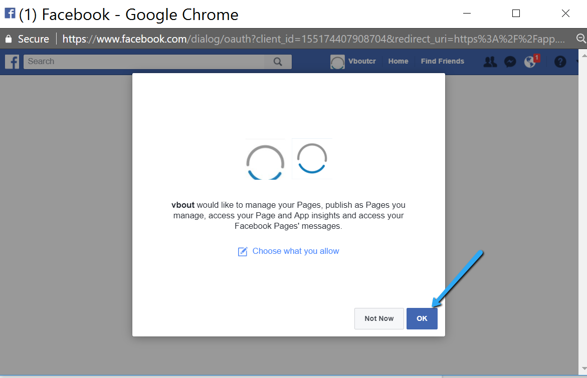 To connect a Facebook company page, you have to click on the Connect a Page and Authorize VBOUT through the 3-steps permission below: