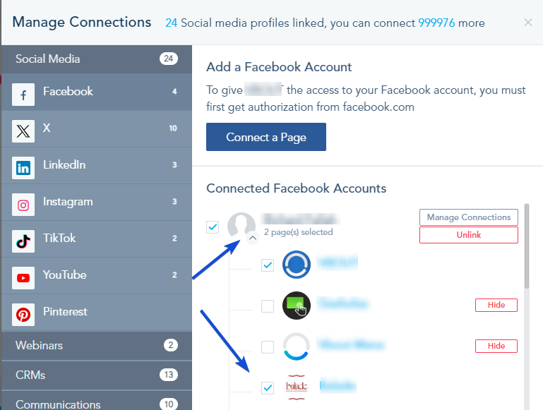 Once you have completed the Authorization prompt, you will be redirected to your Connection Center where you must expand the page and choose which page(s) to manage: