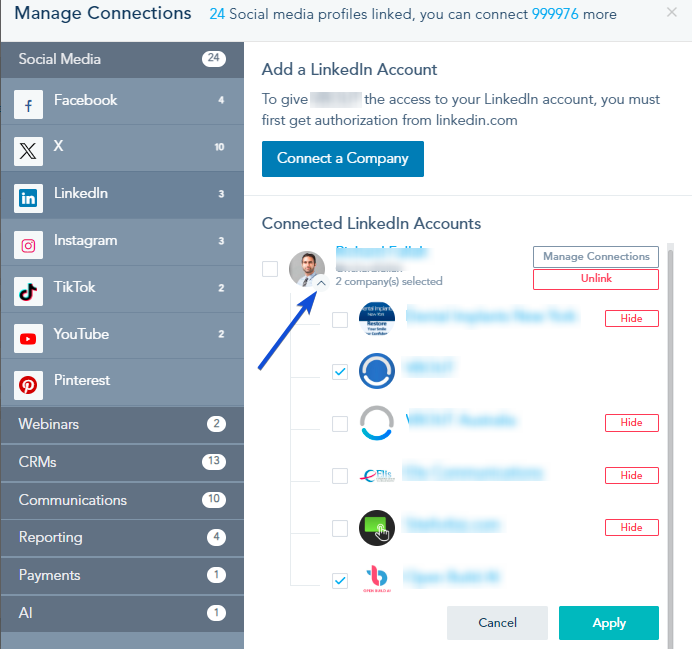 Connecting a LinkedIn Company page works similarly like Facebook Pages. You must expand the profile and choose which company(s) to manage. Each company will be counted as one profile: