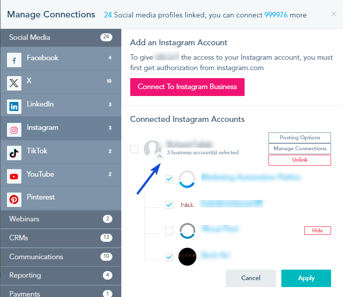 Connecting an Instagram business account will prompt you with the option to choose which page(s) to manage. Each page is counted as a profile:
