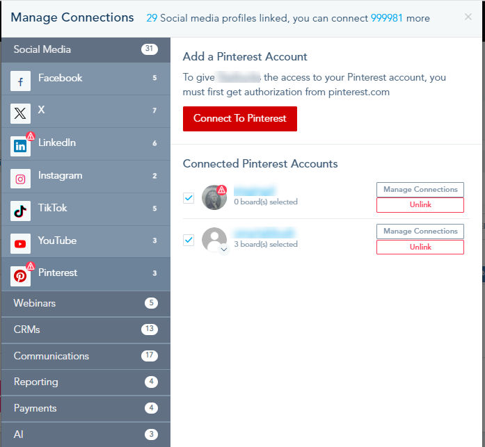 Connecting a Pinterest account will prompt you with the option to choose which Board(s) to manage. Each board is counted as a profile: