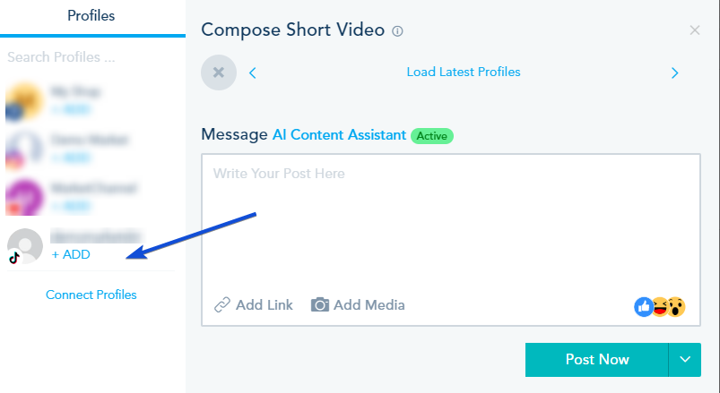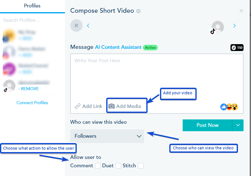 The platform enables you to manage your various Social Media Profiles in one place including posting videos on your TikTok account.