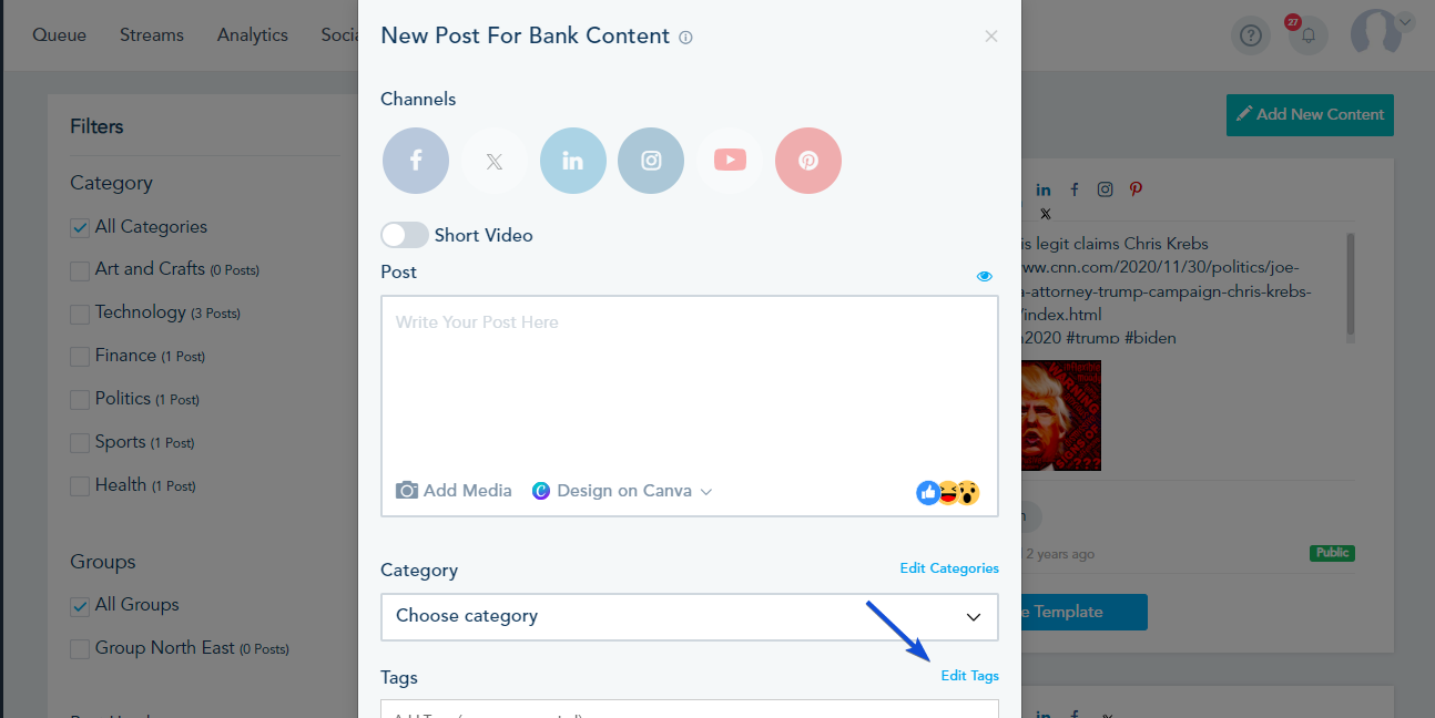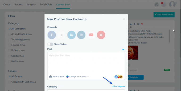 Once you add new content, your Content Bank will look like this and you will be able to filter the templates based on categories and use them in your posts: